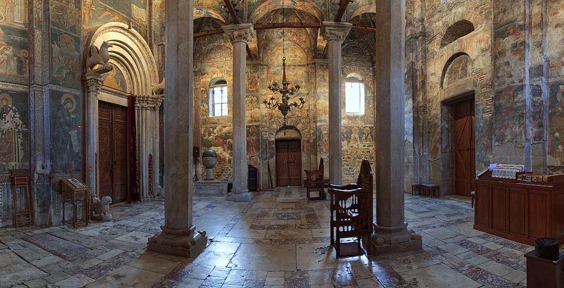 Капители и базе слободних стубова припрате и наоса украшени су разно­врсним флоралним и зооморфним мотивима. На капителу северозападног стуба у припрати извајана су четири апостола у целој фигури, између четири велике птице.